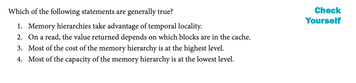 1. Memory hierarchies take advantage of temporal locality.