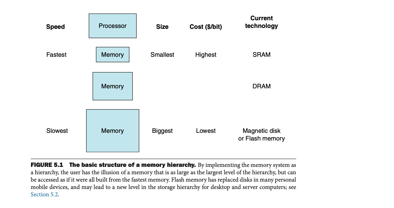 • 프로세서에 가까울수록 메모리는 작고 빠르며 비용이 비싸다(SRAM).