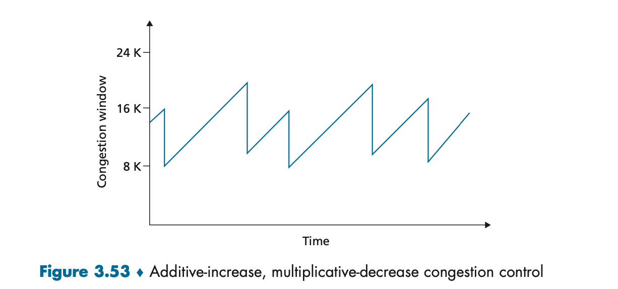 • Figure 3.53은 AIMD 알고리즘이 네트워크에서 “톱니형” 혼잡 창 변화를 생성하는 모습을 보여준다.