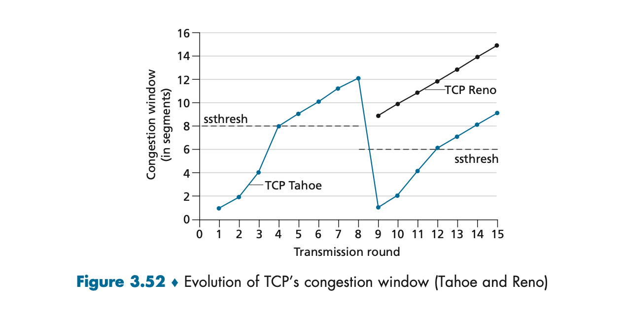 Figure 3.52는 TCP Tahoe와 TCP Reno의 cwnd 변화를 보여준다. Reno는 Tahoe에 비해 손실 이후 더 빠르게 네트워크 상태를 복구하며, Slow Start로 전환하지 않는다.