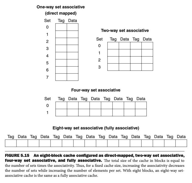 4. Eight-Way Set Associative (Fully Associative): 한 세트에 모든 블록 포함.