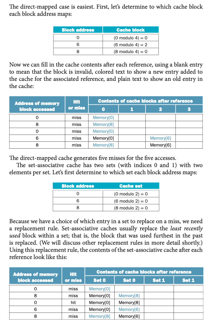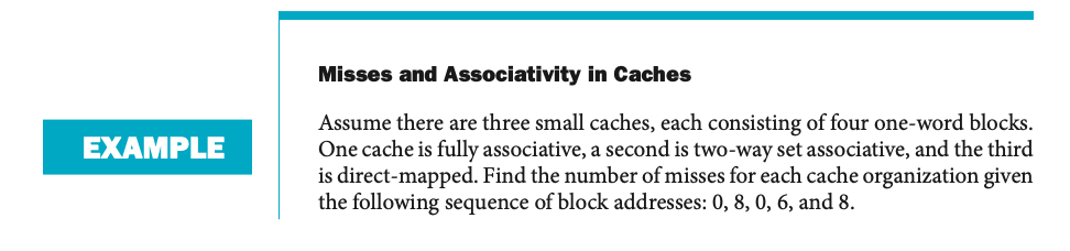• 4개의 블록으로 구성된 캐시에서 0, 8, 0, 6, 8 주소 순으로 접근한다. 각 구조에서 miss 수를 계산하라.