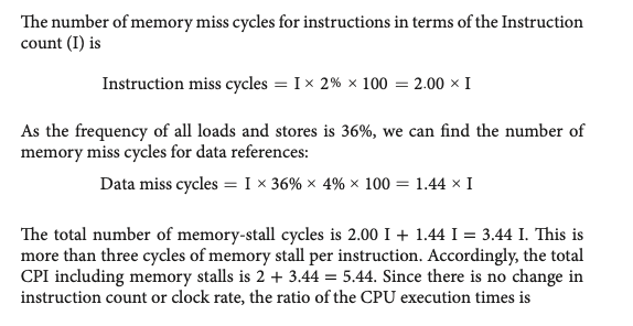 Instruction 캐시 미스율 2%, 데이터 캐시 미스율 4%. 프로세서 CPI는 2이고, 미스 패널티는 100 클록 사이클이다.