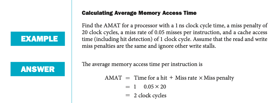 이는 더 큰 캐시에서 데이터를 검색하는 시간이 길어지기 때문이다. 이를 보완하기 위해 **평균 메모리 접근 시간 (AMAT)**를 사용한다: