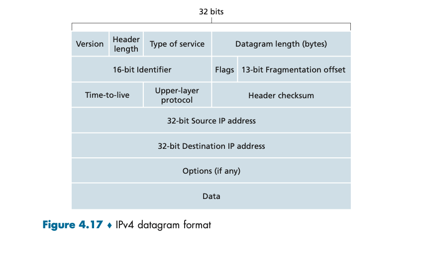 그림 4.17은 IPv4 데이터그램의 포맷을 나타낸다. 각 필드의 크기와 역할은 다음과 같다: