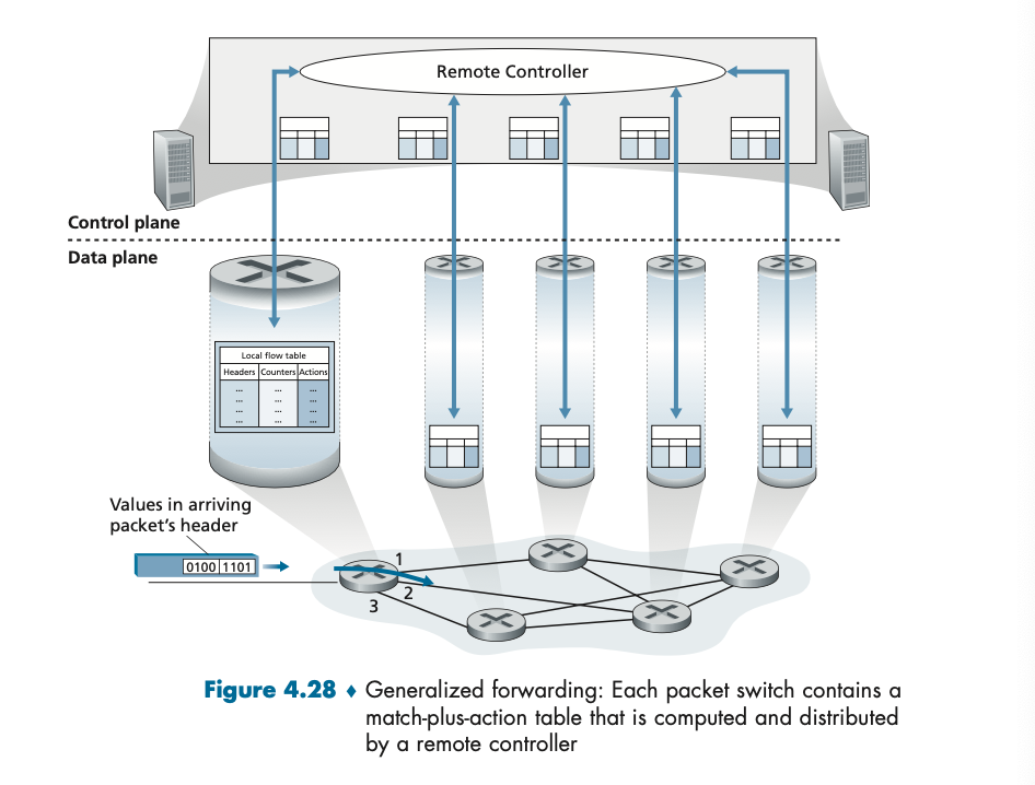 • Generalized Forwarding은 더 많은 헤더 필드(예: MAC 주소, TCP/UDP 포트 번호 등)를 매칭하고, 다양한 Action(전송, 드롭, 리다이렉션 등)을 수행할 수 있다.