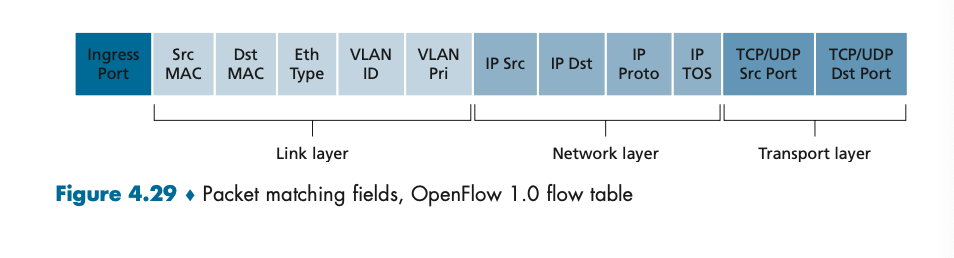 1. 헤더 매칭: OpenFlow는 Link Layer, Network Layer, Transport Layer에서 다양한 필드를 매칭할 수 있다.