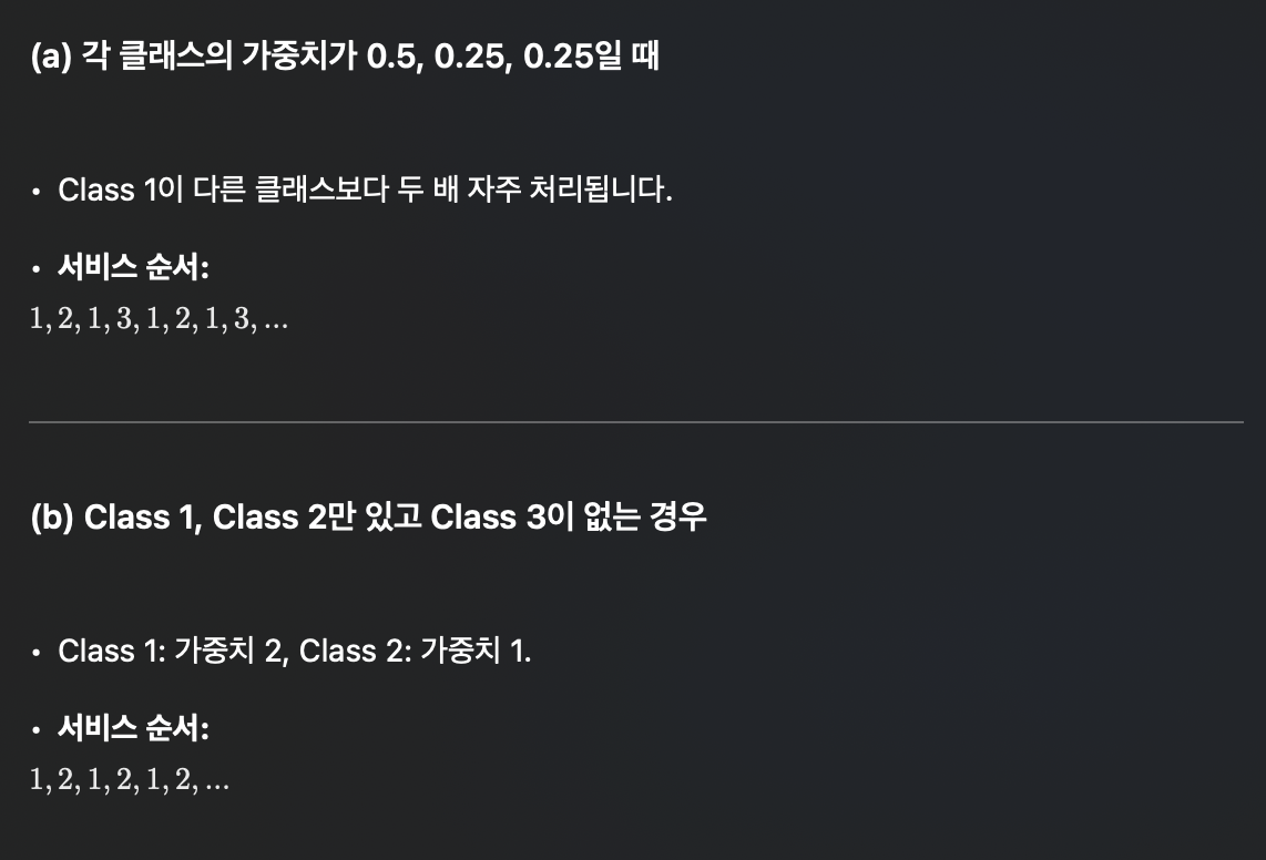 • 각 큐에 가중치를 부여하여 처리 비율을 조정.