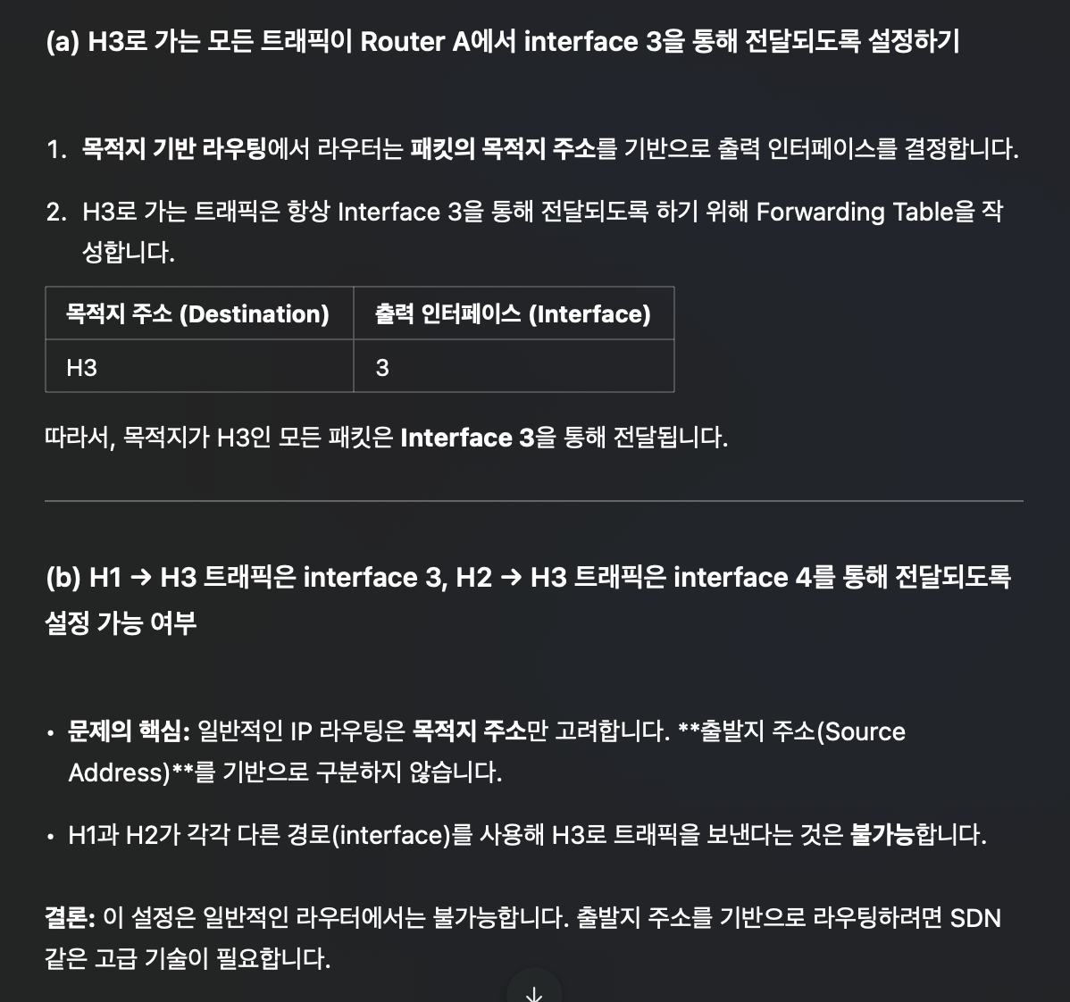 • 목적지 기반 포워딩: 단순히 목적지 IP 주소만 보고 출력 포트를 결정.