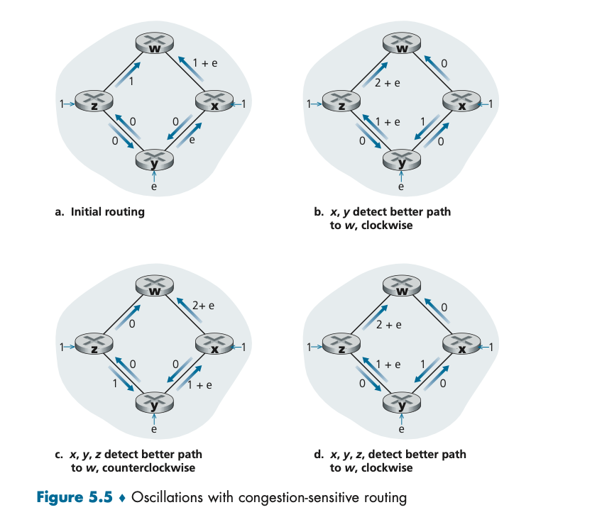 링크 비용이 트래픽에 따라 변동하면, 라우터들이 서로 다른 경로를 반복적으로 선택하며 진동이 발생할 수 있다.
