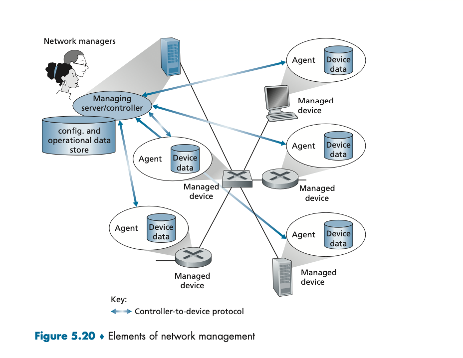 네트워크 관리 프레임워크는 여러 주요 구성 요소로 이루어져 있다 (Figure 5.20 참조):