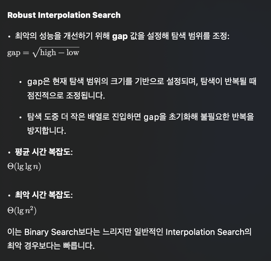 • Binary Search는 중간(mid) 위치를 항상 배열의 가운데로 설정하지만, Interpolation Search는 키 값의 분포에 따라 예상 위치를 계산해 중간값을 동적으로 결정합니다.