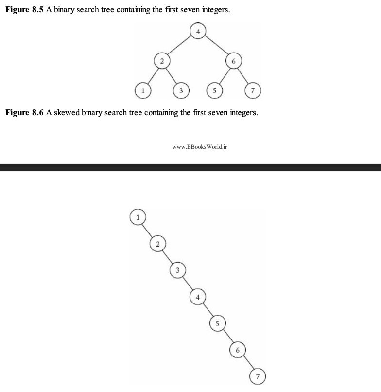 • Figure 8.6: 스큐드(Skewed) 트리 예시. 키가 정렬된 순서로 삽입될 경우.