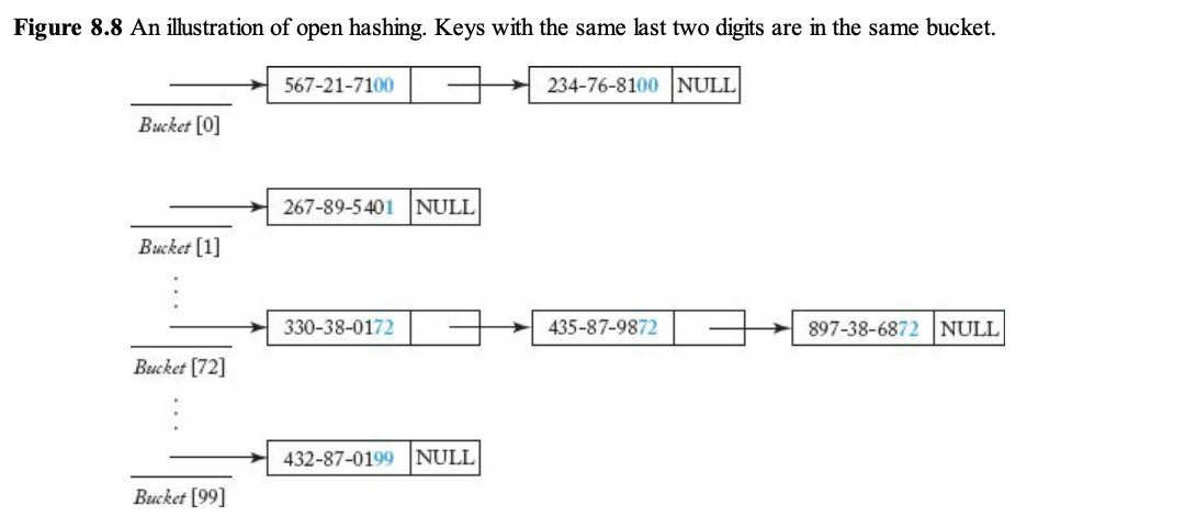 • 그림 8.8에서는 동일한 해시 값을 가지는 키들이 하나의 버킷에 저장된 예를 보여줍니다.