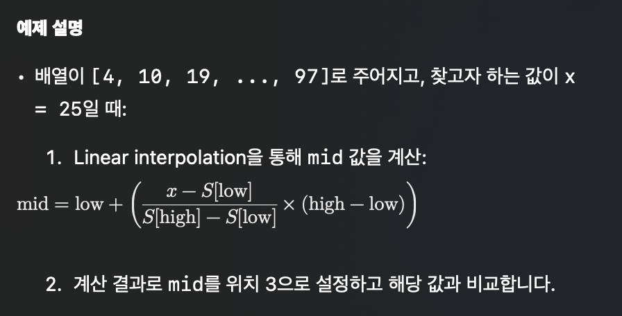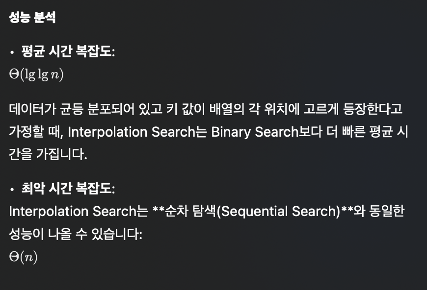 • 이를 통해 데이터가 균일하게 분포된 경우 Binary Search보다 적은 비교 횟수로 원하는 값을 찾을 수 있습니다.