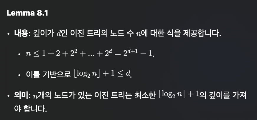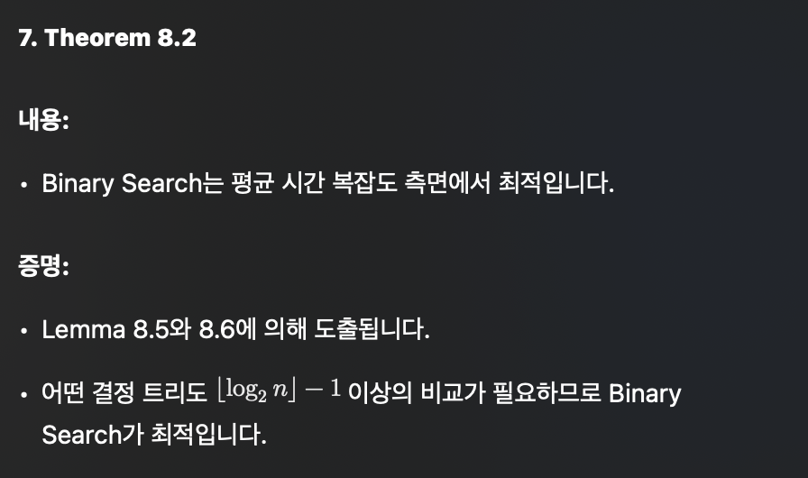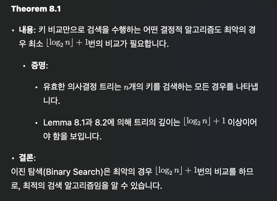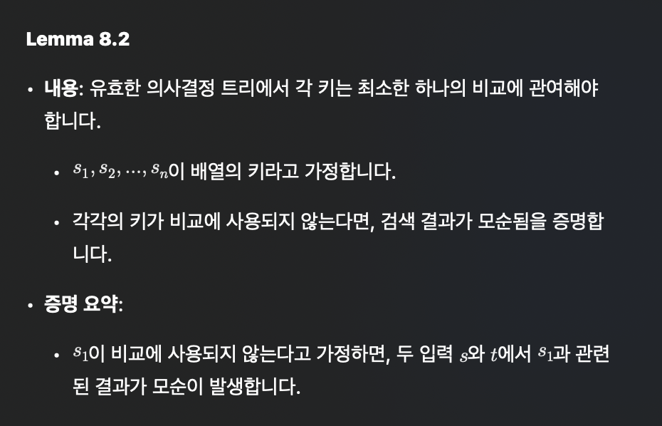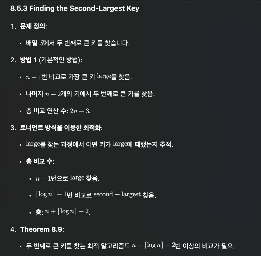 • Theorem 8.7: 어떤 결정적 알고리즘이라도 모든 입력에 대해 n-1 번 이상의 비교를 수행해야 가장 큰 키를 찾을 수 있습니다.