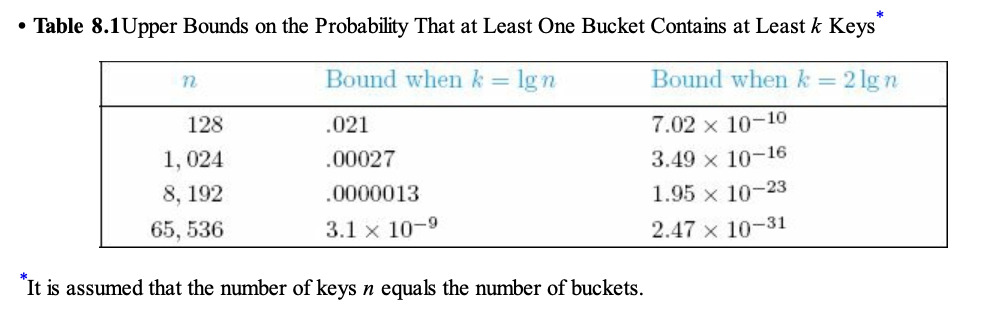 테이블 8.1은 k = \log n 또는 k = 2 \log n 일 때, 충돌 확률을 보여줍니다.