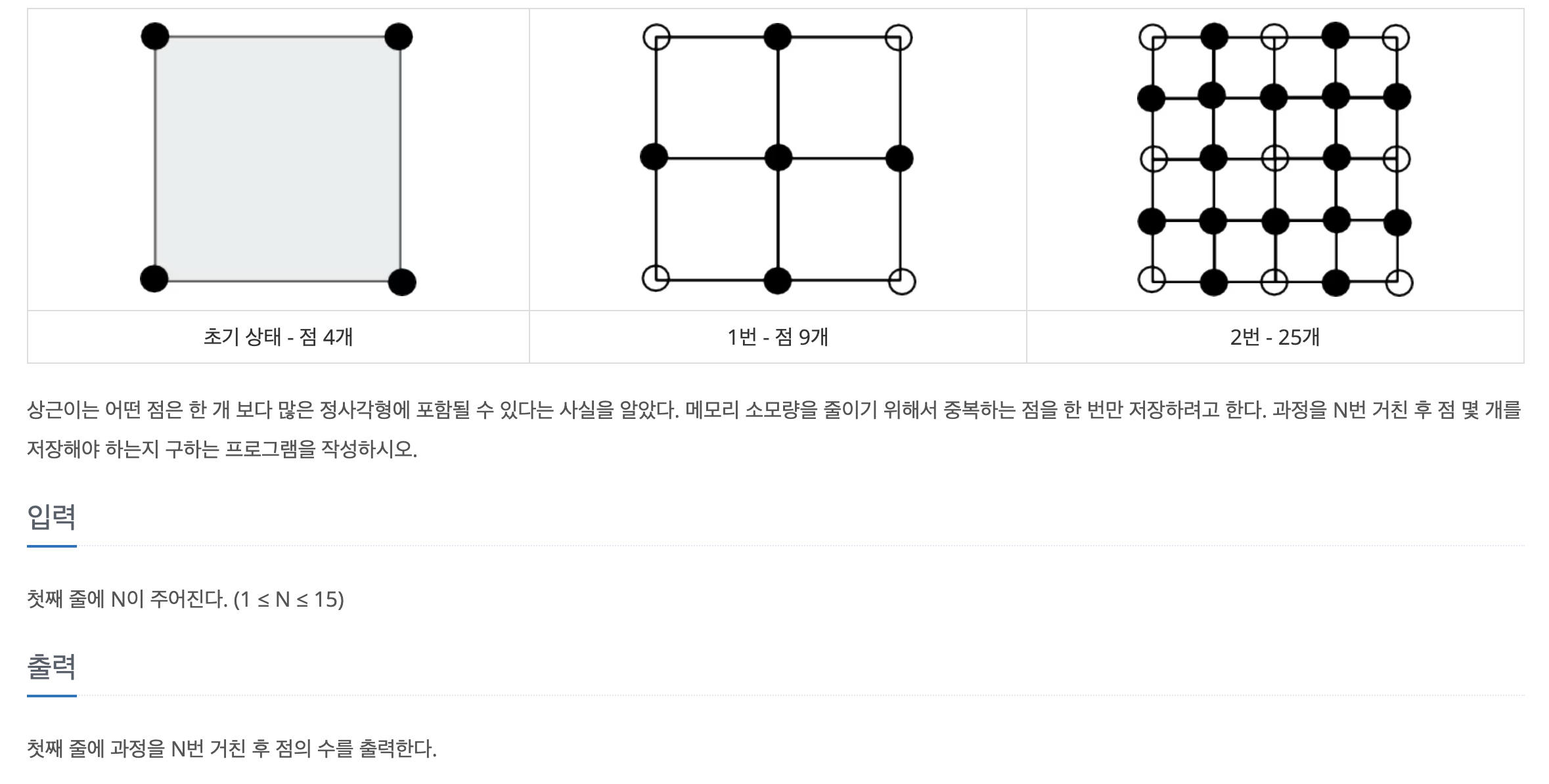 위의 그림과 같은 과정을 n번 거쳤을 때 점의 개수를 구하는 문제입니다.
