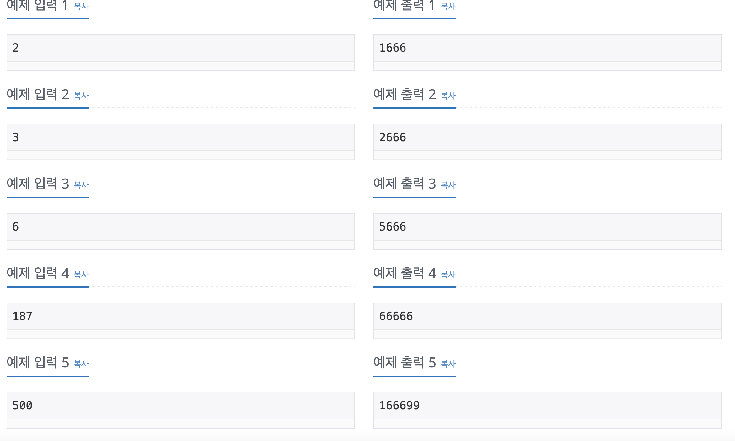 666이 포함된 숫자를 작은 순으로 나열하는 문제입니다.