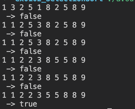 이와 같이 정렬되는 과정과 정렬되었을 떄 true 를 출력하고 끝나는 것을 확인할 수 있다.