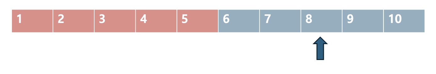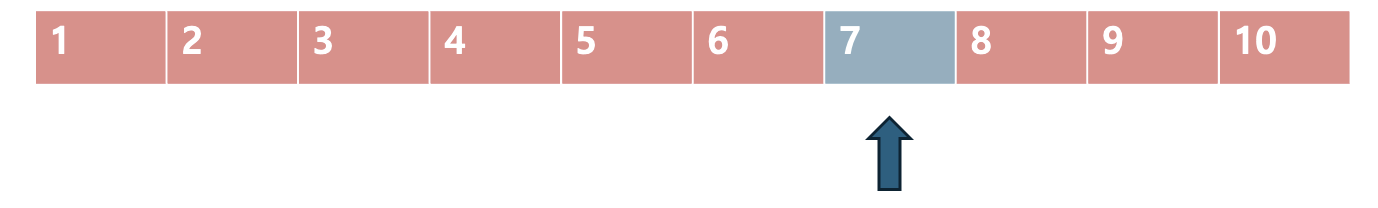 찾고자하는 7은 5보다 크기 때문에, 왼쪽 절반을 다 탐색 범위에서 없앱니다.