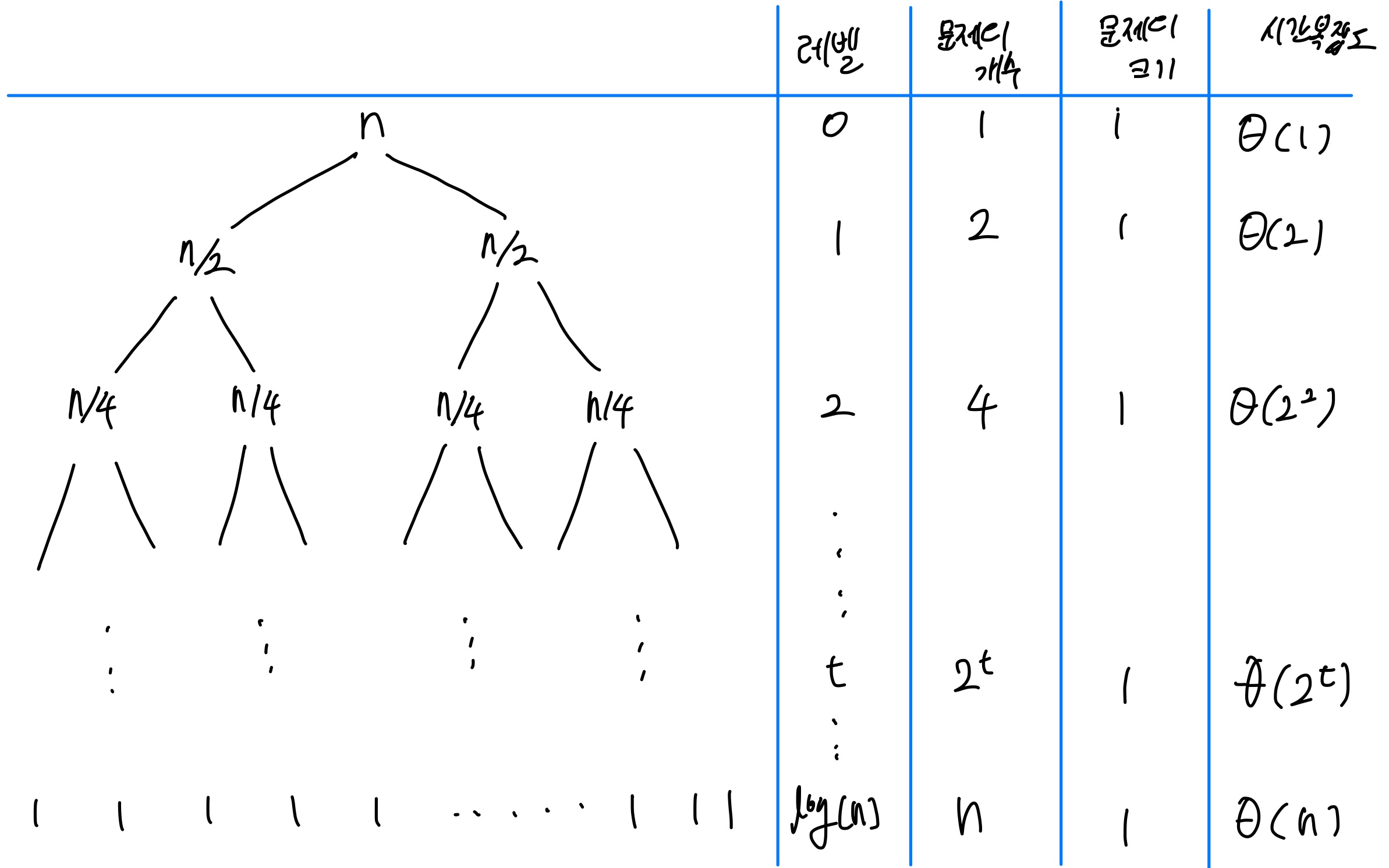 각 레벨의 문제의 개수 * 각 레벨의 문제의 크기 = n 이므로 각 레벨의 시간 복잡도를 O(n) 이라고 할 수 있는 것입니다.