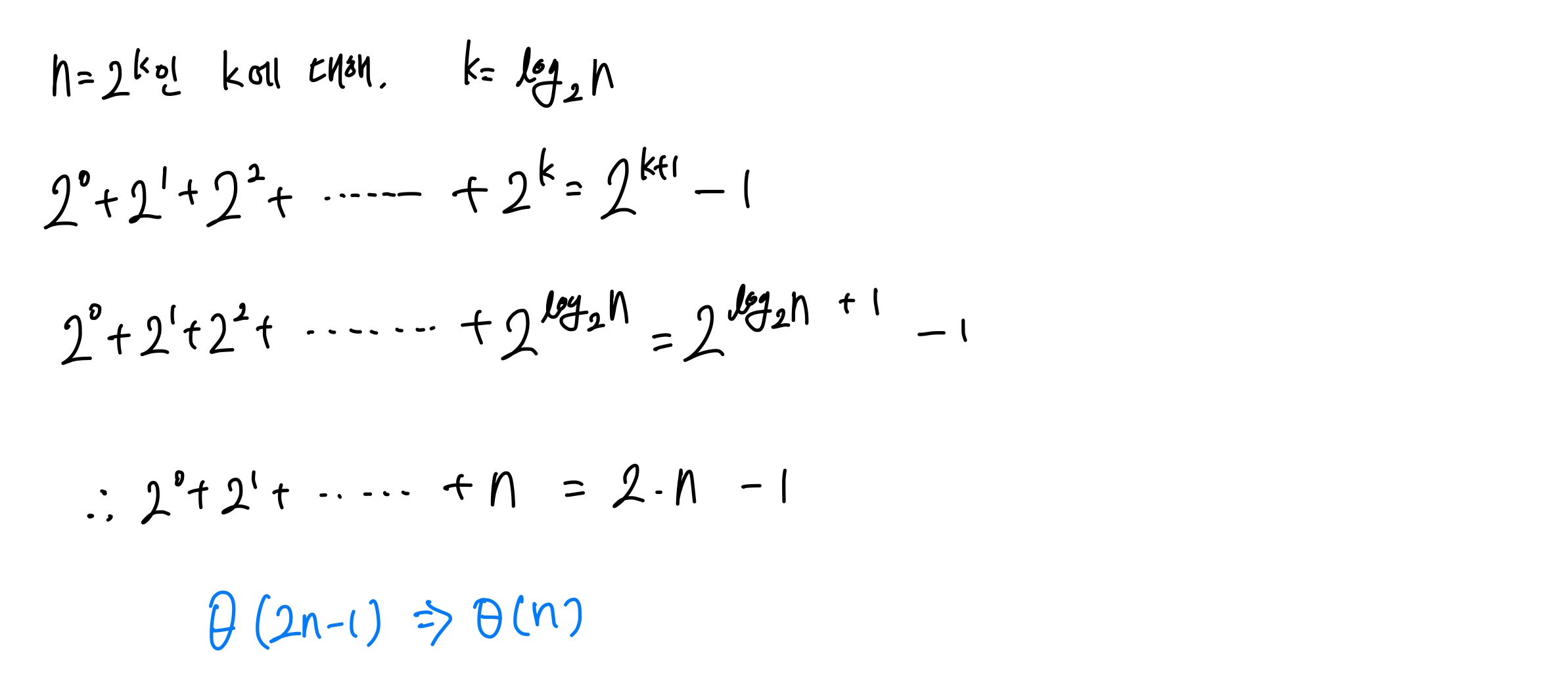 거듭제곱의 합의 성질을 이용하여 시간 복잡도를 구하는 과정입니다.