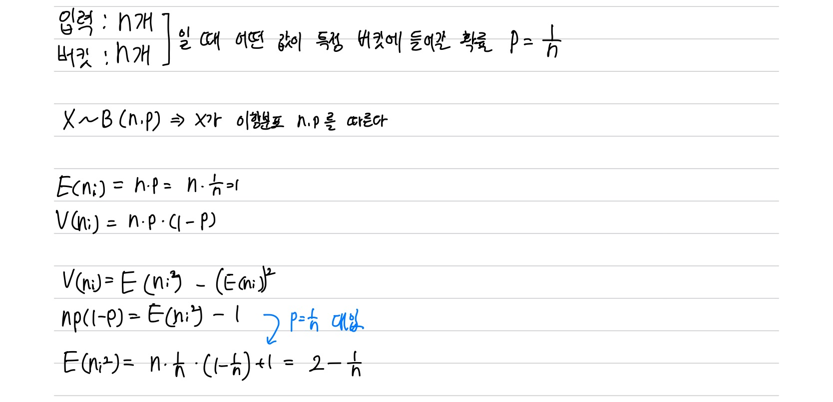 버킷의 개수와 입력의 개수 모두 n개라고 가정했을 때 평균 시간복잡도는 𝜭(n)인 것을 확인할 수 있습니다.
