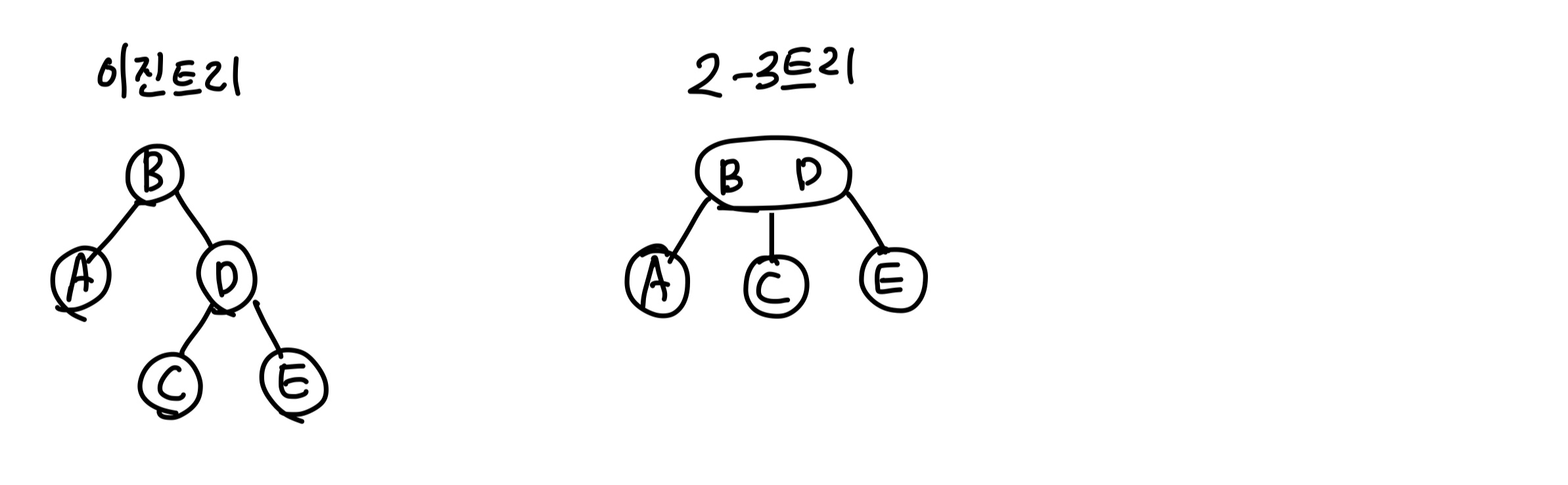 하지만 2-3트리에서는 한 노드가 두개의 키값을 가질 수 있고, 세개의 자식을 가질 수 있습니다.