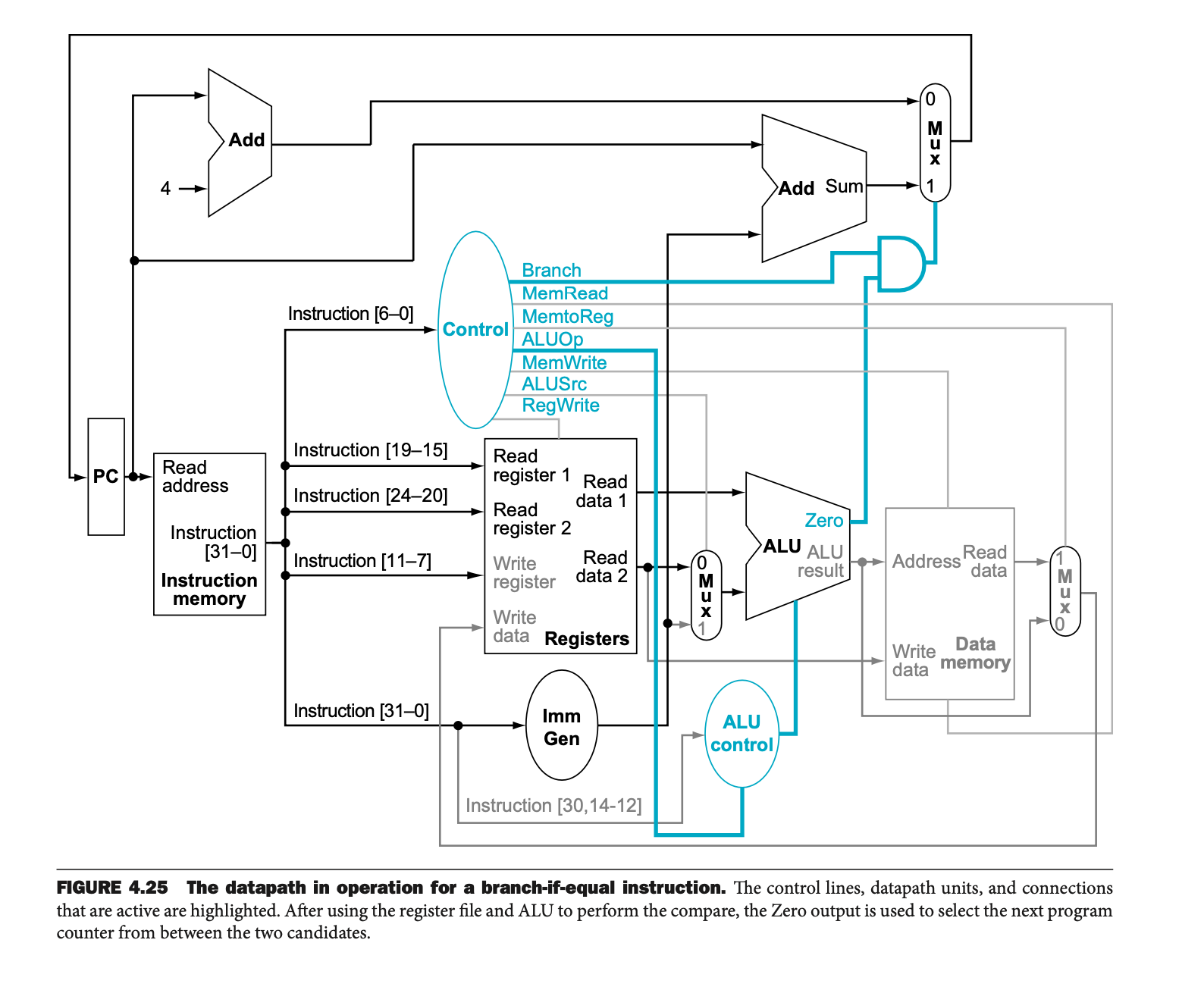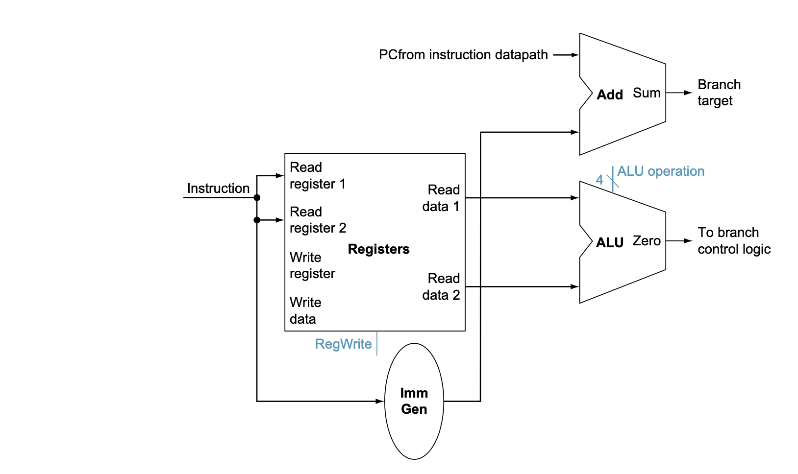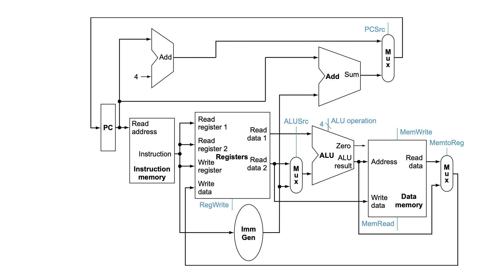 • Branch: 분기 명령어(beq)에서 사용되며, ALU가 두 레지스터를 비교한 결과에 따라 다음 명령어의 주소를 결정한다.