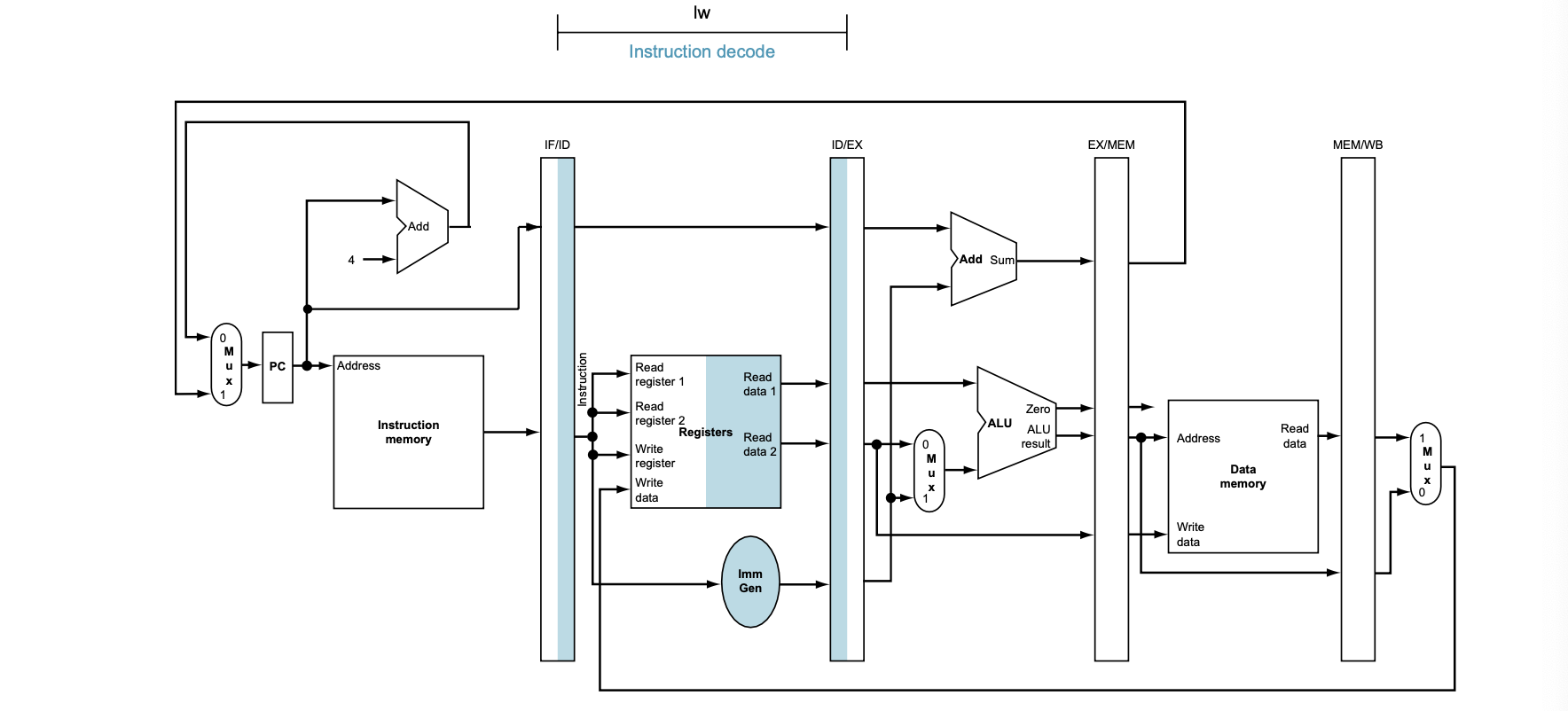 • lw 명령어에서 레지스터 번호와 즉시값이 해석된다. ID/EX 파이프라인 레지스터에 저장되며, 읽어야 할 레지스터 값과 주소가 계산된다.