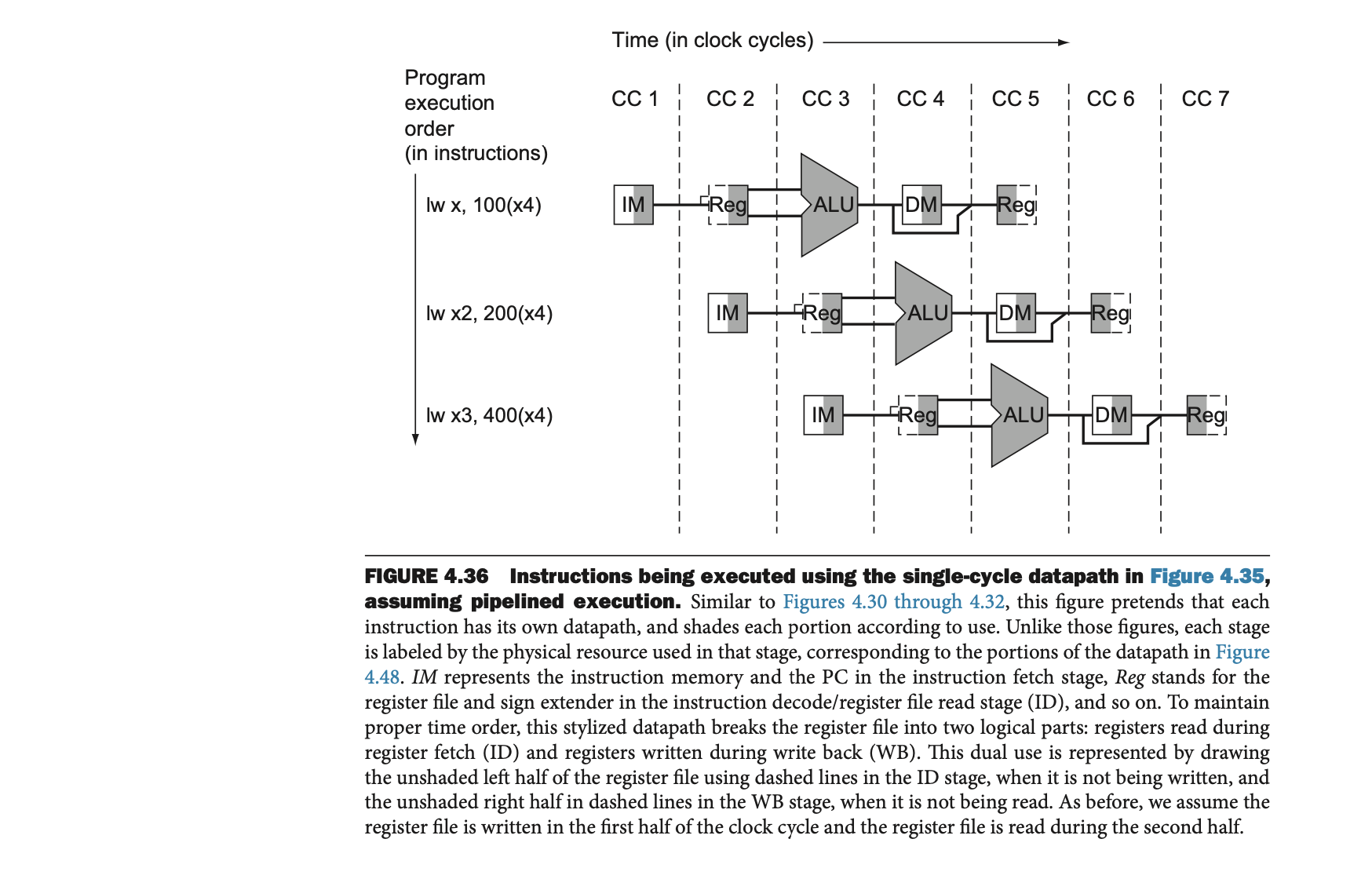 • Figure 4.36에서는 파이프라인 실행을 가정하여 각 명령어가 고유의 데이터 경로를 가진다고 설명한다. '각 명령어는 각자의 데이터 경로를 가지며, 공유된 타임라인에 배치되어 서로의 관계를 나타낸다.