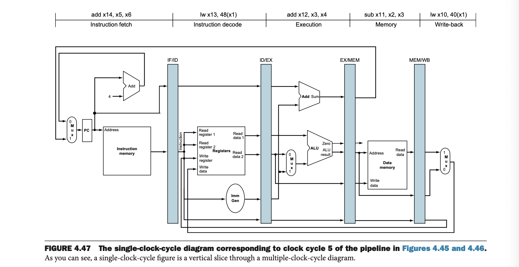그림 4.47에서는 단일 클럭 사이클 다이어그램을 보여주며, 이는 다중 클럭 사이클 다이어그램에서 각 명령어가 실행되는 특정 클럭 사이클을 세로로 잘라낸 형태이다.
