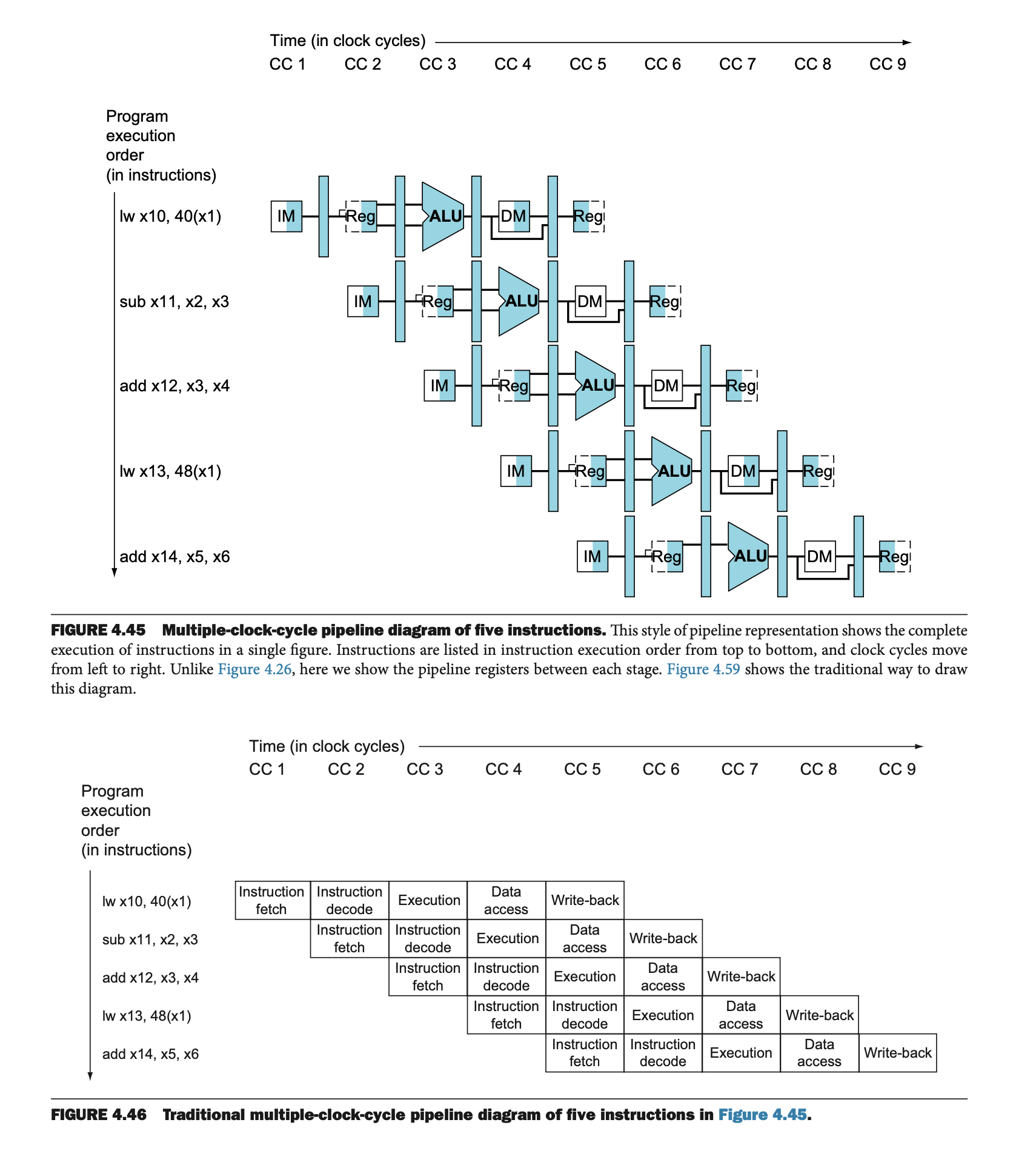 그림 4.45에서는 여러 명령어가 파이프라인을 통해 실행되는 다중 클럭 사이클 파이프라인 다이어그램을 보여준다.