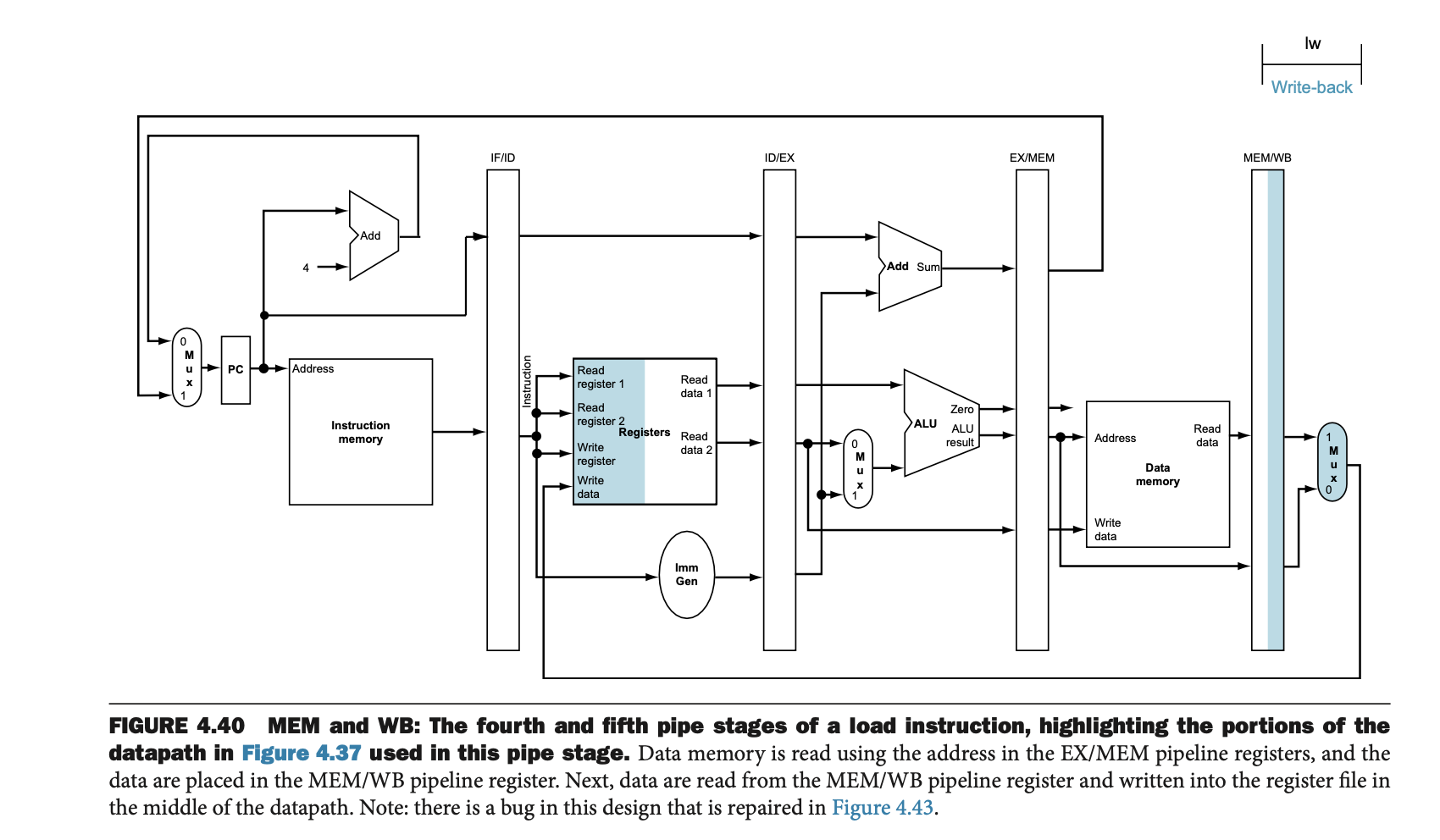 • Figure 4.40의 하단에 있는 쓰기-back 단계에서는, MEM/WB 파이프라인 레지스터에 저장된 데이터를 레지스터 파일에 다시 저장하는 작업이 이루어진다.