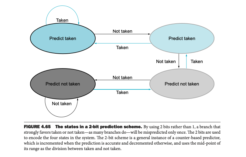 • 2-bit 예측기는 1-bit 예측기를 개선한 방식으로, 분기가 자주 일어날 때 잘못된 예측을 줄이기 위한 방법이다.
