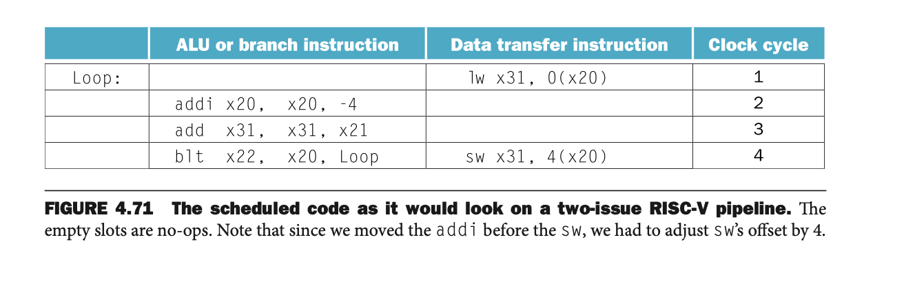 정적 다중 명령어 처리 (Static Multiple Issue)의 예시 코드 스케줄링을 보여준다. 이 예시는 정적 방식으로 명령어들을 처리하는 방식이다.