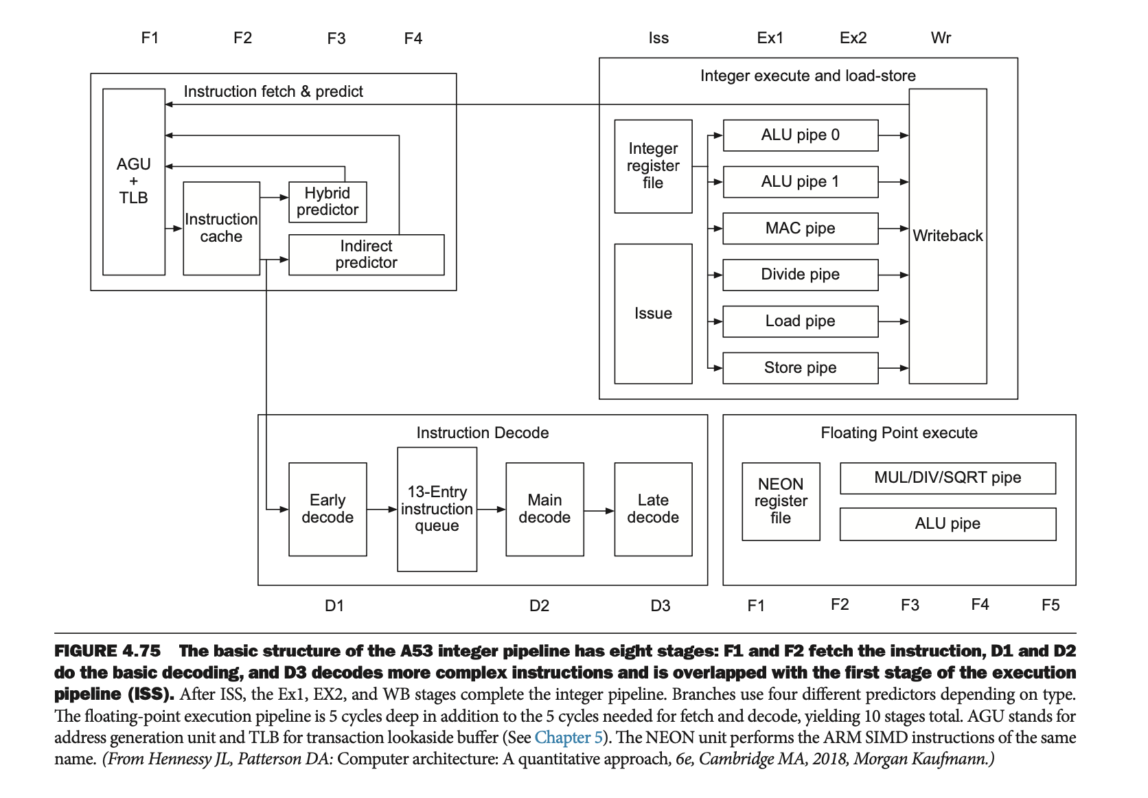 실제 ARM A53 프로세서의 구조를 예시로 보여주며, 복잡한 동적 파이프라인에서 어떻게 여러 명령어를 동시에 처리할 수 있는지 설명한다.