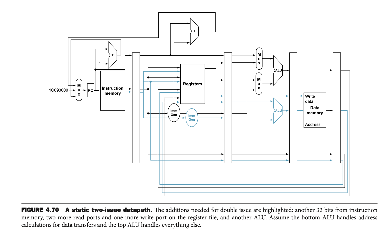 • Figure 4.70은 Static Two-Issue Datapath로, 명령어 두 개를 동시에 처리하기 위한 추가적인 하드웨어 자원을 포함한다.