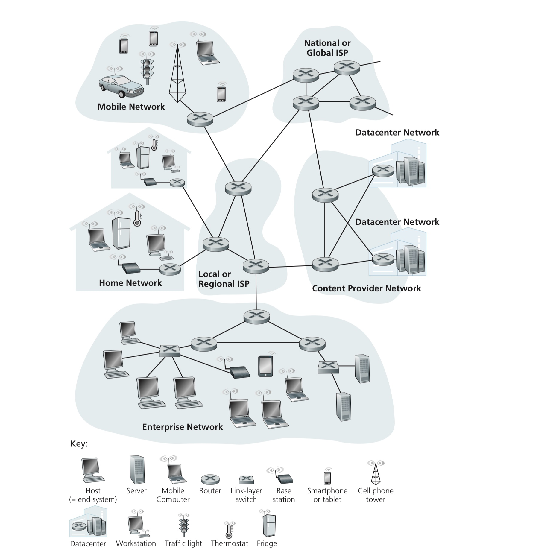 1.1 What Is the Internet?- 인터넷이 무엇이냐는 질문이 들어왔을 때 기본 하드웨어와 소프트웨어 구성요소를 볼트와 너트에 비유할 수 있다. - 또한, 우리는 각가의 계층에 서비스를 제공하하는 서비스라고도 할 수 있다. 1.1.1 A Nuts-and-Bolts Description-인터넷은 전세계의 수많은 computing device 들을 서로 이어주는 컴퓨터 네트워크이다. -얼마 전까지만 하더라도 이 computing devices라는 것들은 리눅스 작업환경이나 서버 등을 가리켰지만, 현재, 2025년에는 전세계 75%의 사람들이 인터넷을 사용할 것이라는 연구결과가 있을 정도로 많이 발전했다. - 게다가 이제는 원래 인터넷과 관련 없던 것들(안경이나 TV, 시계, 보안시스템 등..