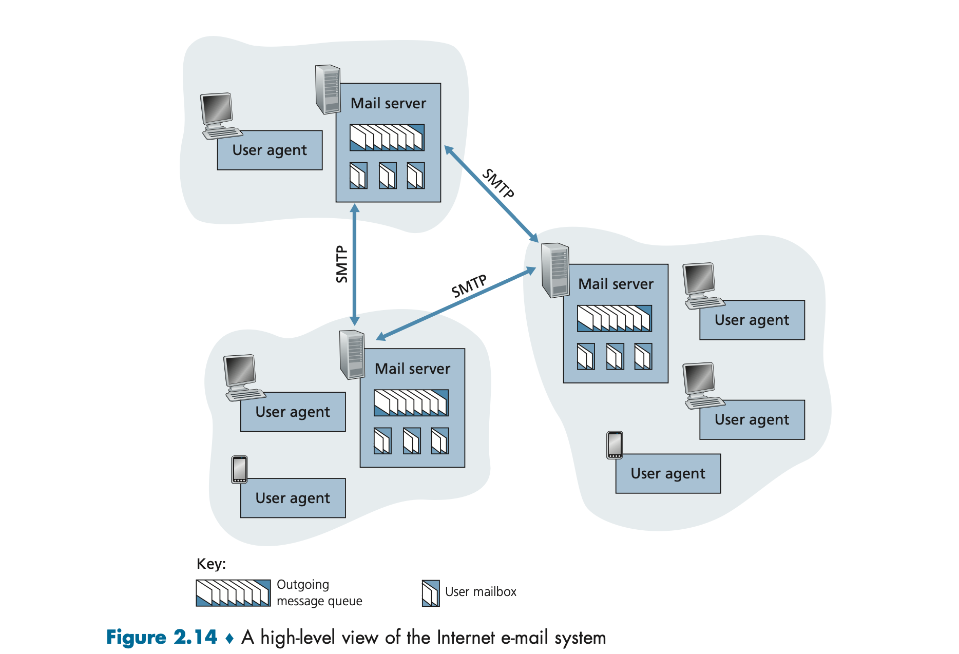 2.3 Electronic Mail in the Internet-사용자는 user agent 를 통해 이메일을 작성, 전송, 읽기 등의 작업을 한다. ex) Outlook, Gmail, Apple mail 등등 - 사용자가 메일을 작성하면 이는 송신자의 Mail Server로 전달된다. Mail Serveroutgoing message queue를 통해 발신되는 이메일을 관리한다.종류1. SMTP client 2. SMTP server SMTP ProtocolTCP기반의 프로토콜로 송신메일서버와 수신메일서버 간 메일을 전송하는 데 사용된다. 이메일 전송 과정1. 이메일 전송버튼을 누르면 클라이언트의 user agent가 클라이언트의 메일서버로 보낸다.2. 메일서버는 이 메세지를 outgoing mess..