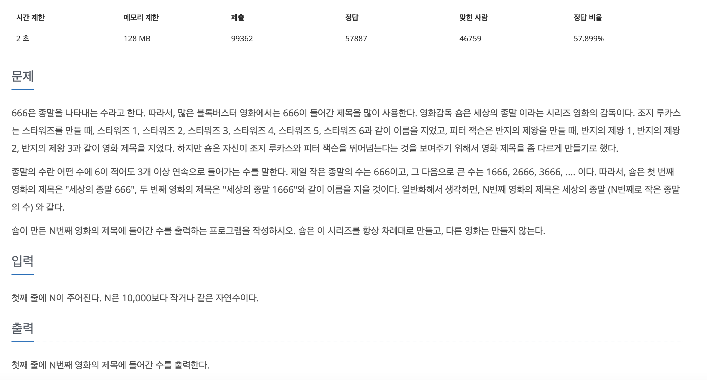 666이 포함된 숫자를 작은 순으로 나열하는 문제입니다. 이런 문제에는 두가지 선택지가 있습니다.1. 규칙을 찾아서 풀 것인가.2. 하나하나 나열해서 풀 것인가. 우선 규칙이 있나 찾아보기 위해 작은 수부터 나열해보겠습니다.더보기666 1666 2666 3666 4666 5666 6660 6661 6662 6663 6664 6665 6666 6667 6668 6669 7666 8666 9666 10666 11666 12666 13666 14666 15666 16660 16661 16662 16663 16664 16665 16666 16667 1666..